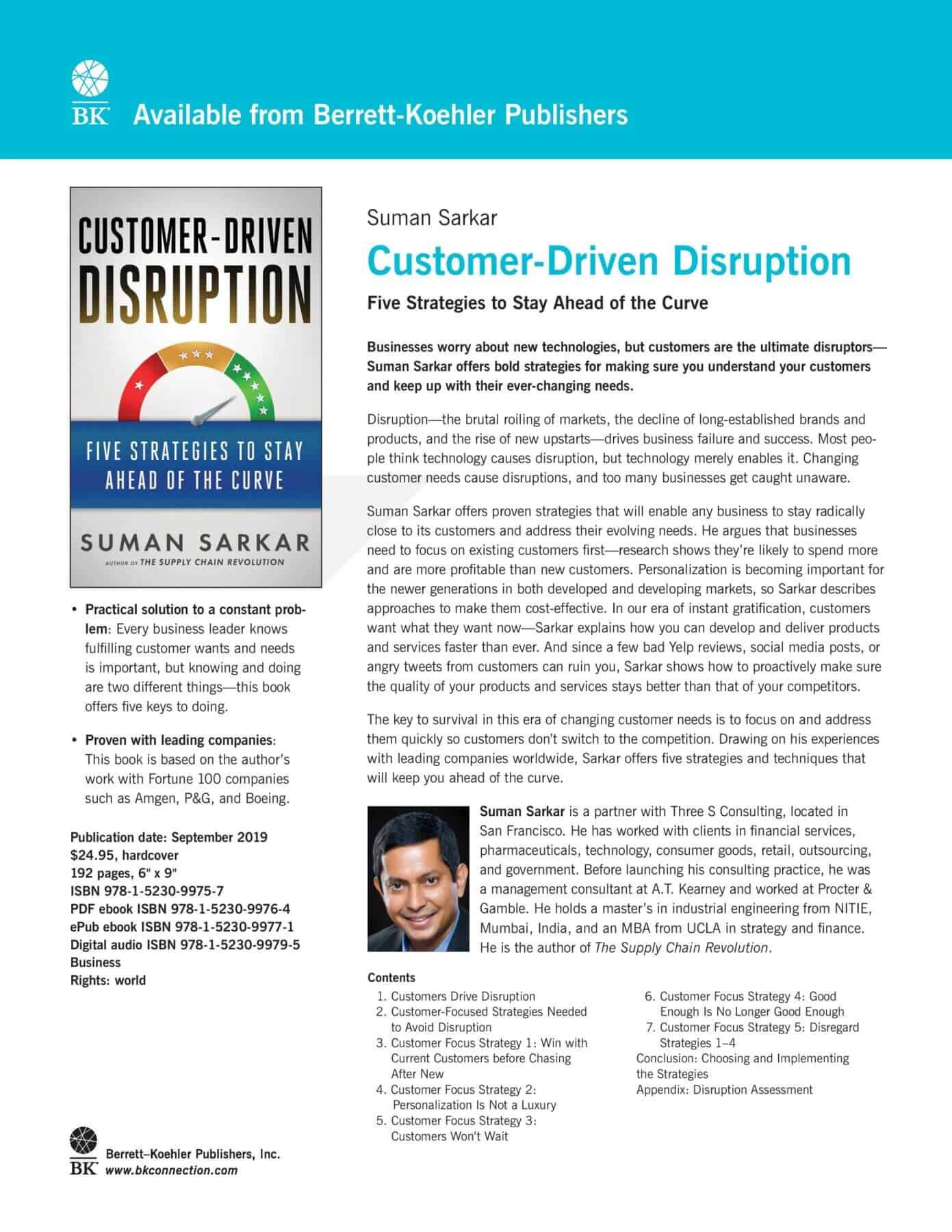 Suman Sarkar is an international consultant and partner at Three S Consulting. He has advised over forty Fortune 500 companies on strategy and operations. His latest book, Customer-Driven Disruption (Berrett-Koehler, 2019), provides a blueprint for companies on how to adapt to the constantly shifting global demographics and markets. The book draws on Sarkar’s extensive experience and includes case studies from companies worldwide that have succeeded in competitive and unpredictable marketplaces.